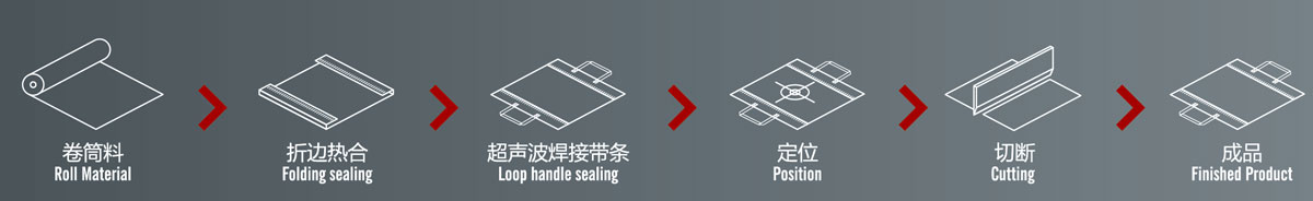 2.本機通過折邊后,再經(jīng)過左右兩臺燙把機把雙手提條焊好,裁切出來。
